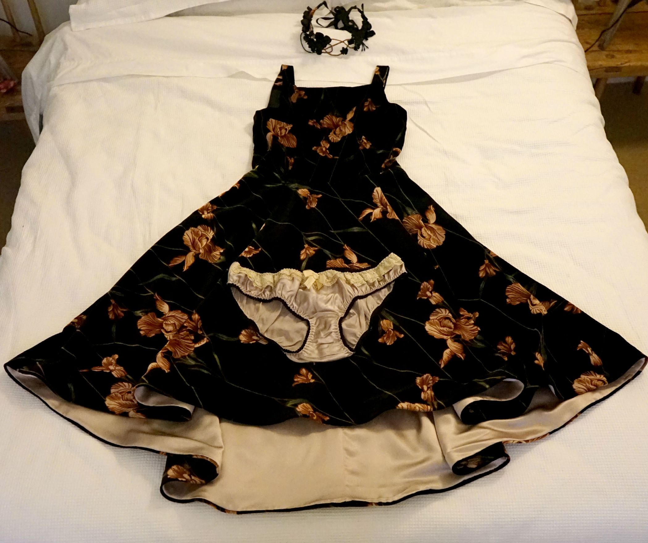 Photos by Bruce. Flower crown from Gardens of Whimsey. Tights from Wolford. Shoes from Camper. Lace on undies from Lily Pond. Necklace from Quirk Collective.