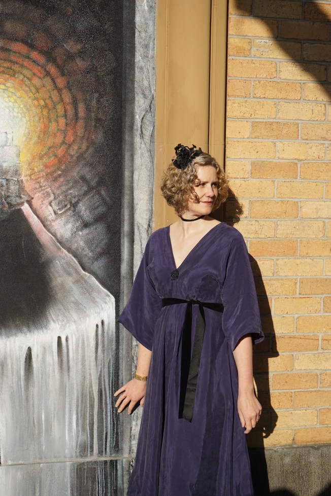 The sleeves are dramatic, the neckline plunging and the fabric now swishes like silk and sits beautifully (it is actually a rayon that behaves like silk satin cut on the bias….). The motif used to secure the neckline was found at Lily Pond. I was looking for a piece of vintage lace to insert however this caught my eye and matched perfectly with the fabric. The ribbon also manages to sit with out moving. I did make the threaded loops to hold the belt in place but they popped as soon as I put the dress on. I don’t think I will redo them as the velvet held its place rather well.